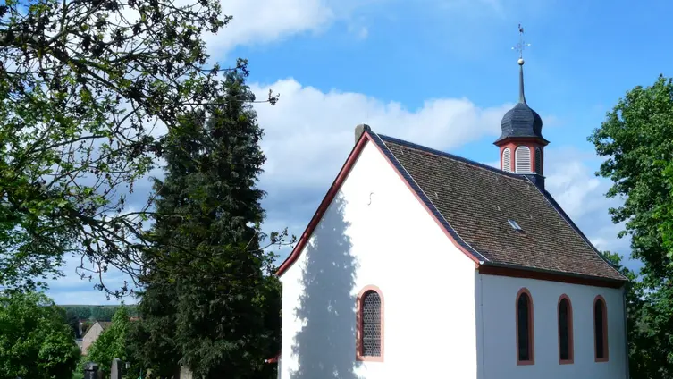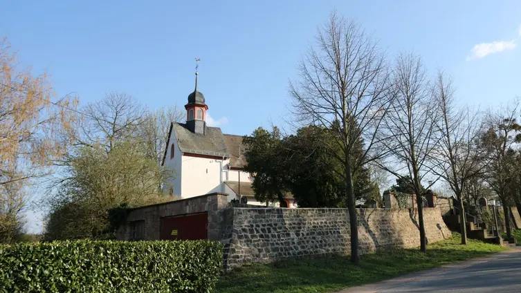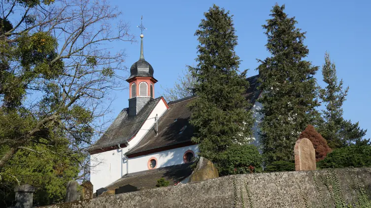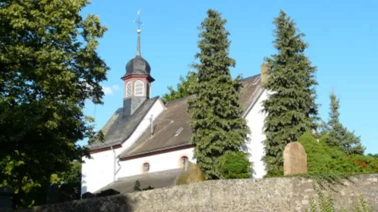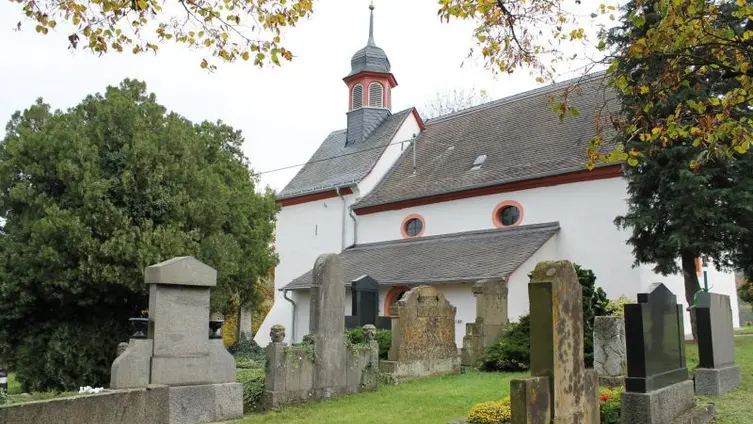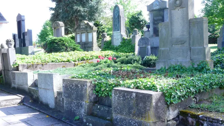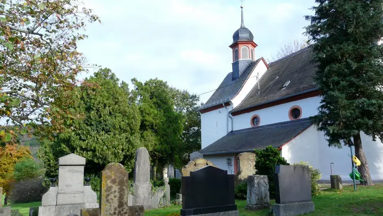 Darüber hinaus mussten sie sich an der Anlage des neuen katholischen Friedhofs am Ortsausgang in Richtung Frei-Laubersheim zur Hälfte beteiligen und schließlich wurde die Burgkapelle neugotisch erweitert. Die Familie Michel aus der Weidenmühle spendete damals den Acker an der Kreuznacher Straße und erhielt im Gegenzug das Familiengrab links neben dem Eingang der Kirche mit Grundbucheintrag. Sogar konfessionell verschiedene Ehepaare wurden gemäß ihrer Religionszugehörigkeit getrennt auf dem jeweiligen Friedhof bestattet. Seit die evangelische Kirchengemeinde in den 1960iger Jahren ihren Friedhof der bürgerlichen Gemeinde übertragen hat, konnten dann auch wieder katholische Gemeindeglieder dort beigesetzt werden. In den 1970er Jahren sind die Gräber auf der linken Seite abgeräumt worden, sie stammten vom Anfang des 19. Jhd, also noch aus Zeiten, in denen beide Konfessionen hier ihre Toten bestatteten. Die drei Steine aus der Zeit des Biedermeier wurden erhalten und hier aufgestellt. Der mittlere war für eine junge Frau die noch nicht verheiratet war. Der abgebrochene Baumstamm mit darüber drapiertem Brautkranz symbolisiert, dass hier eine Jungfrau ohne Nachkommen bestattet wurde. Die Gräber auf der rechten Seite stammen aus der Zeit vor dem Ersten Weltkrieg und sollen nun für die Nachwelt erhalten werden. Der schwarze Stein rechts neben dem Kircheneingang mit seinen stilisierten Rosenbordüren ist ein besonders gelungenes Beispiel aus der Zeit des Jugendstils.