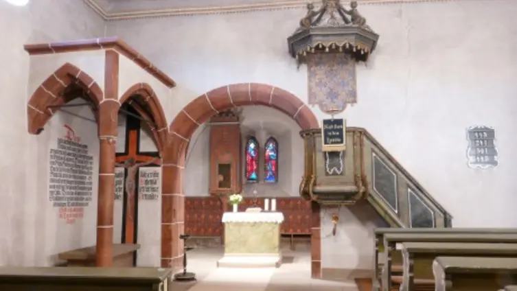 Die Evangelische Kirche von Neu-Bamberg war ursprünglich die Kirche des untergegangenen Dorfes Sarlesheim. Die Endung „heim“ sagt uns, dass es sich hier um eine fränkische Siedlung gehandelt haben muss. Ihre Anfänge kann man also in die Zeit der so genannten fränkischen Landnahme zwischen 500 bis 800 nach Christus datieren. Das Dorf gehörte ursprünglich zum Streubesitz der Raugrafen von Altenbamberg im Appelbachtal. Die Kirche wurde, wie viele in dieser Zeit, auf einer leichten Anhöhe errichtet. Bei der ev. Kirche von Neu-Bamberg kann man die Anlage besonders gut erkennen, weil das Dorf rundherum fehlt und nur noch die Kirche übrig geblieben ist... Umgeben von einem Kirchhof mit einer hohen Mauer konnten sich die Dorfbewohner bei Gefahr in Ihren Schutz zurückziehen.